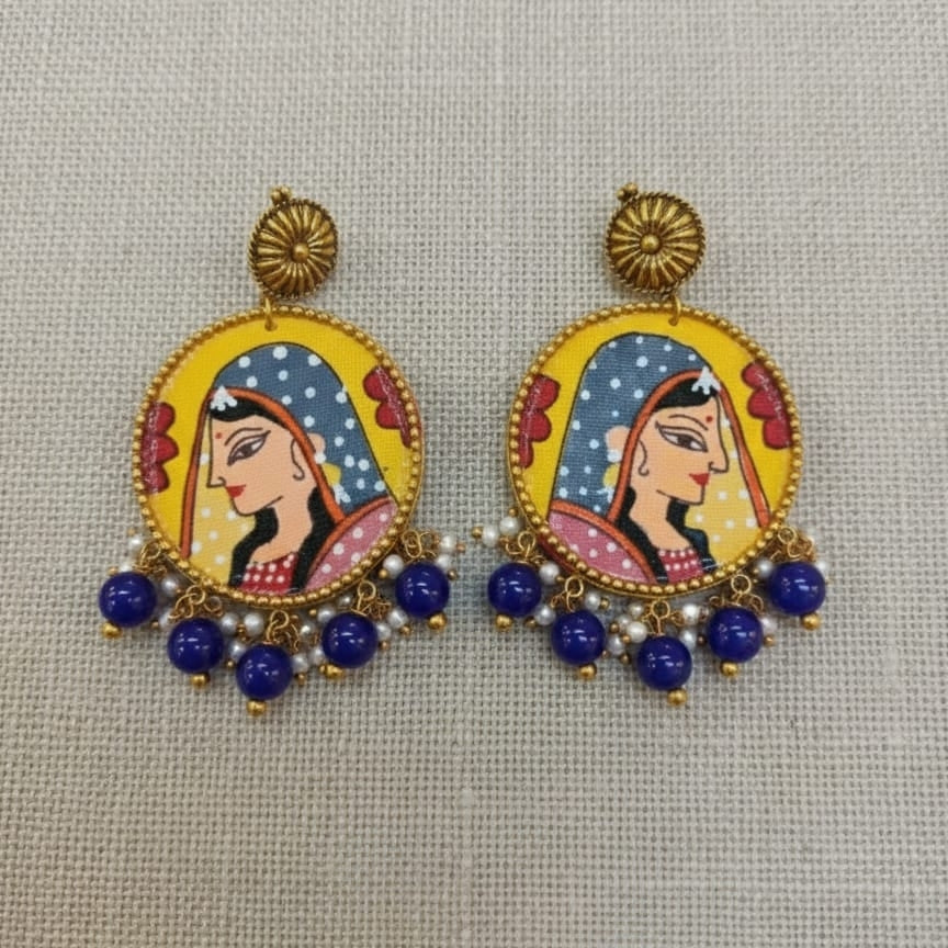 આ ઉત્કૃષ્ટ હાથથી રંગેલા બાની થાની પોટ્રેટ ઇયરિંગ્સ સાથે તમારા ઘરેણાંના સંગ્રહમાં કાલાતીત વારસાનો સ્પર્શ ઉમેરો. સુપ્રસિદ્ધ "ભારતની મોના લિસા" થી પ્રેરિત, આ ઇયરિંગ્સમાં પરંપરાગત ભારતીય મહિલાનું કાળજીપૂર્વક હાથથી દોરેલું પોટ્રેટ છે, જે ગ્રેસ અને સુંદરતાનું પ્રતીક છે.