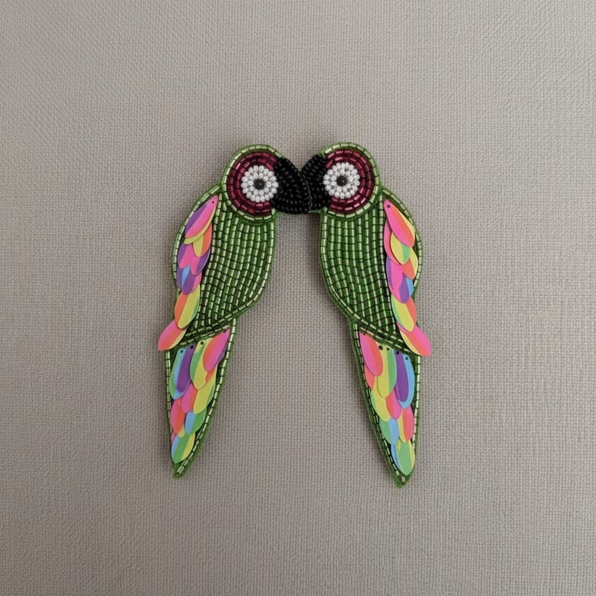 જટિલ મણકાનું કામ ઉષ્ણકટિબંધીય પક્ષીઓના રમતિયાળ ભાવનાને કેદ કરે છે, જ્યારે બહુ-રંગી સિક્વિન પાંખો મેઘધનુષી જાદુનો સ્પર્શ ઉમેરે છે જે દરેક હિલચાલ સાથે પ્રકાશને પકડી લે છે. હળવા અને આરામદાયક, આ સ્ટેટમેન્ટ ઇયરિંગ્સ સોફ્ટ ફેબ્રિક બેઝ પર ડિઝાઇન કરવામાં આવી છે, જે તેમને કોઈપણ ભારે ખેંચાણ વિના આખા દિવસના પહેરવા માટે યોગ્ય બનાવે છે.